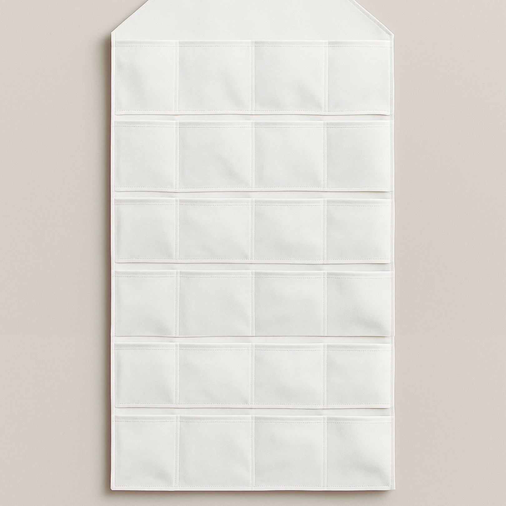 White advent calendar wall hanging with multiple pockets for countdown to holidays