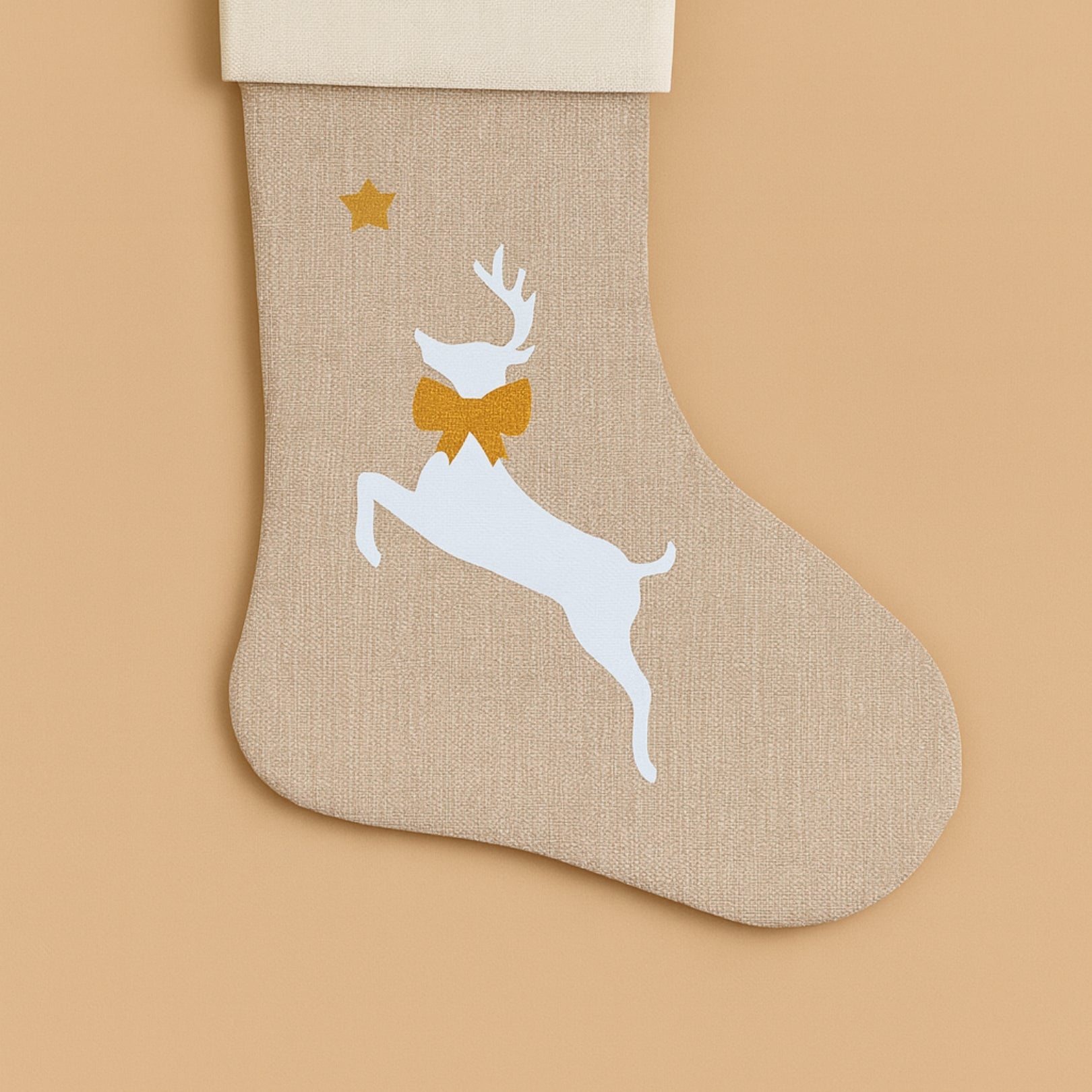 Custom printed rustic Christmas stockings for mantle featuring a white reindeer design with a bow